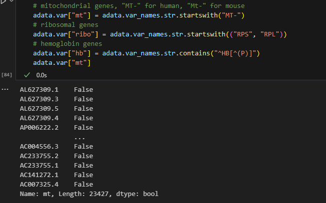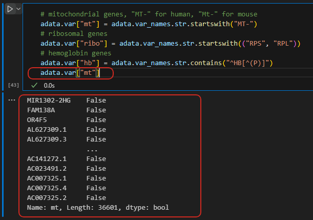 相当于对全部的基因做字符匹配,标记符合匹配规则的基因。可以稍微看一下所存放的mt数据,看样子key为基因名,value为bool类型,即true/false,示意是否属于“mt”类型。因为总共有36601个基因,所以总长度为36601。