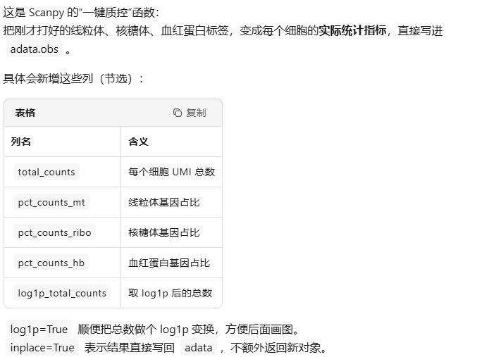 “写进obs”和"新增这些列",说明这些qc指标是以细胞为单位的,即,对一个细胞的所有基因做统计,然后得到这个细胞的这些指标,存放到var里。