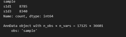 输出说明第一个文件包含了8785个细胞数据,第二个文件包含8340个细胞数据。在合并之后,总共有17125个细胞(obs),然后每个细胞有36601个基因(var),所以形成一个17125 * 36601的矩阵。