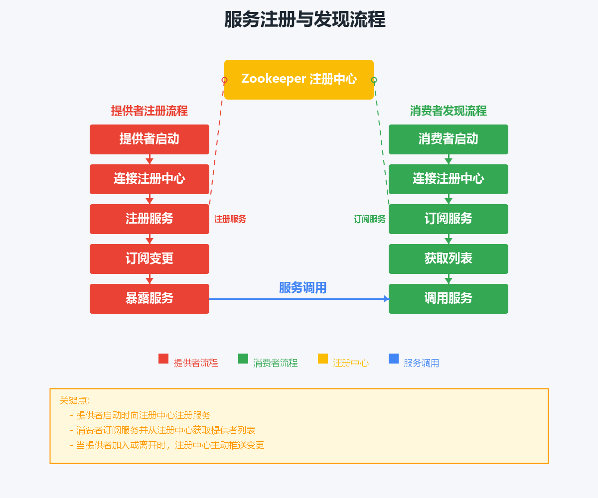 服务注册与发现是Dubbo的核心机制,分为两个流程: