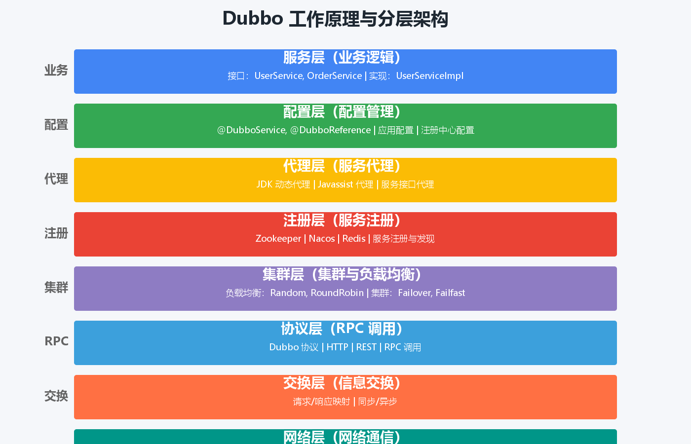 - Config层(配置层):@DubboService、@DubboReference等配置