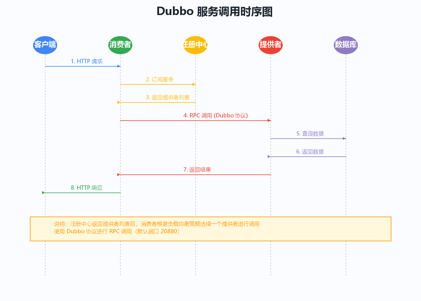 从时序图中可以看到,一个完整的Dubbo服务调用包含以下步骤: