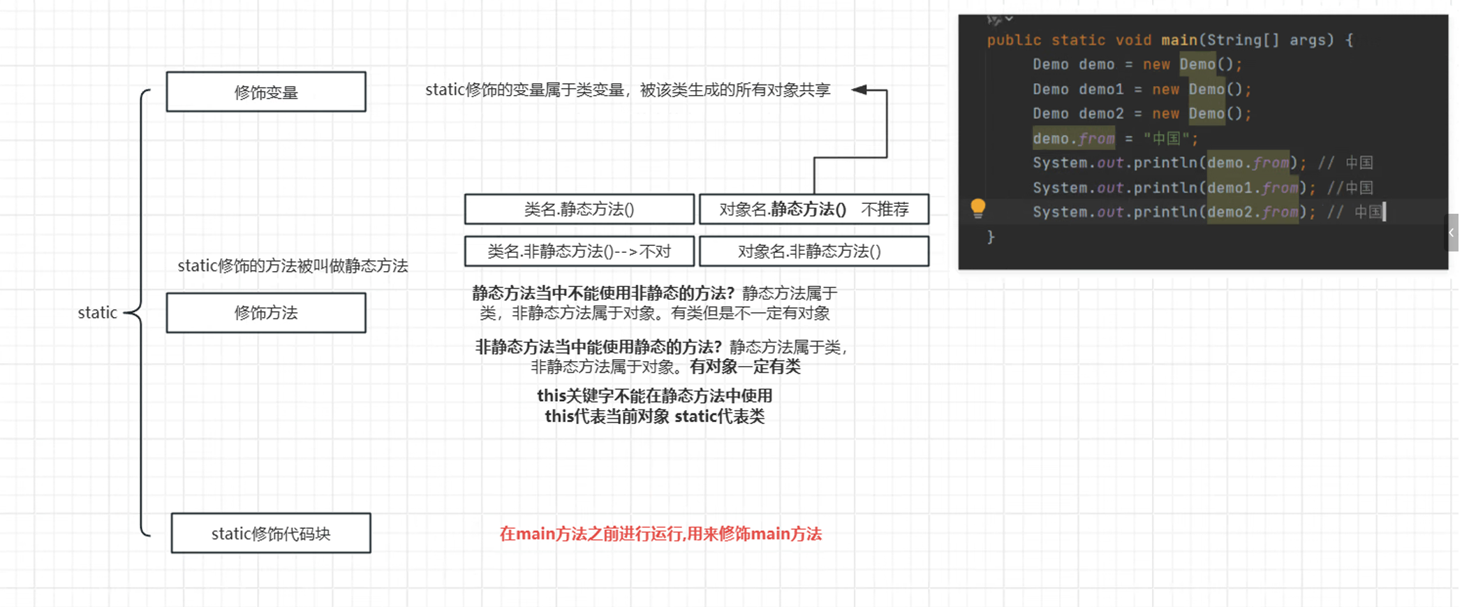 - 静态方法中不能直接访问非静态成员(因为非静态成员属于对象,静态方法调用时可能无对象存在)。